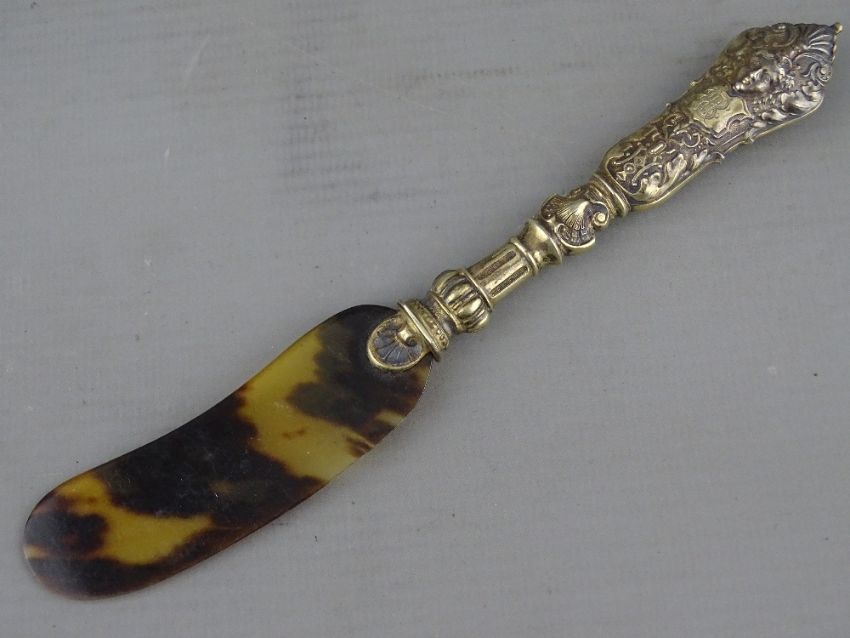 A SET OF SIX CONTINENTAL SILVER & TORTOISESHELL EFFECT KNIVES & SPOONS with embossed mask handles, monogrammed cartouche, stamped 800, 18.5 and 19 cms long respectively