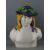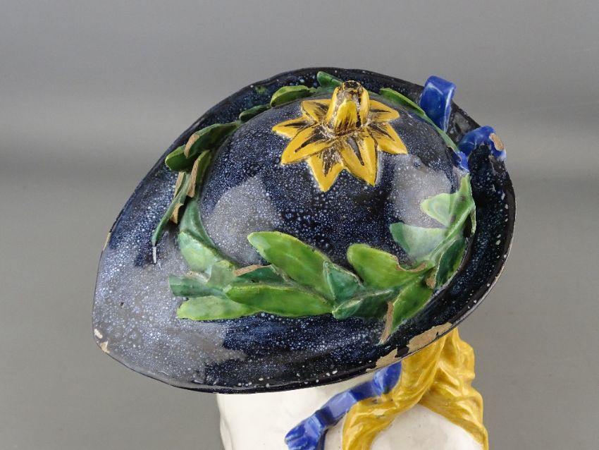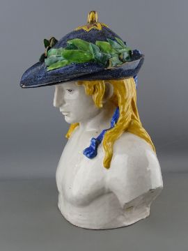 AN ITALIAN TERRACOTTA POTTERY MAJOLICA BUST of a young man with flowing golden hair and garland hat, decorated in tin glaze enamels in the style of Cantagalli, painted cockerel mark to the base, 35 cms high (chips and losses to the hat rim and garland)