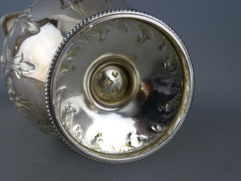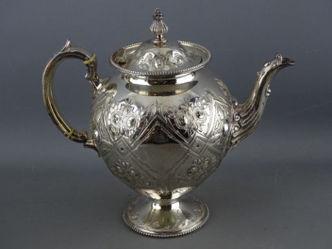 AN EXCELLENT MARTIN HALL & CO SILVER PLATED THREE PIECE PEDESTAL TEASET, chased and relief decorated, the twin handled sugar bowl and milk jug both gilt lined, 22.5 cms high the teapot, good clear marks to the bases, circa 1880 (no inscriptions or monograms)