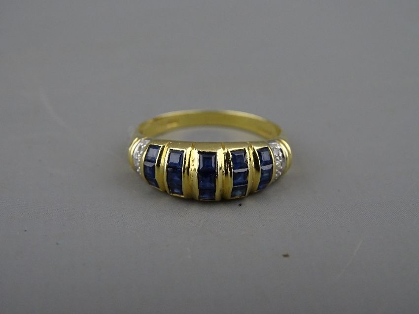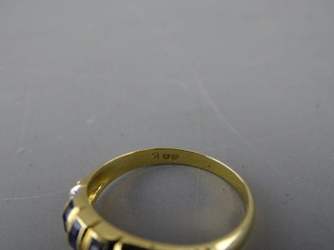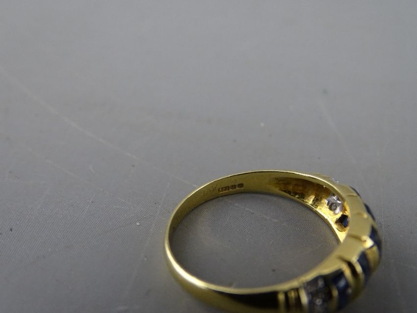 A FOURTEEN CARAT GOLD SAPPHIRE & CZ DRESS RING, the sapphires set in five triples, size 'N/O', 3.3 grms together with a pair of matching fourteen carat gold earrings, 7 grms