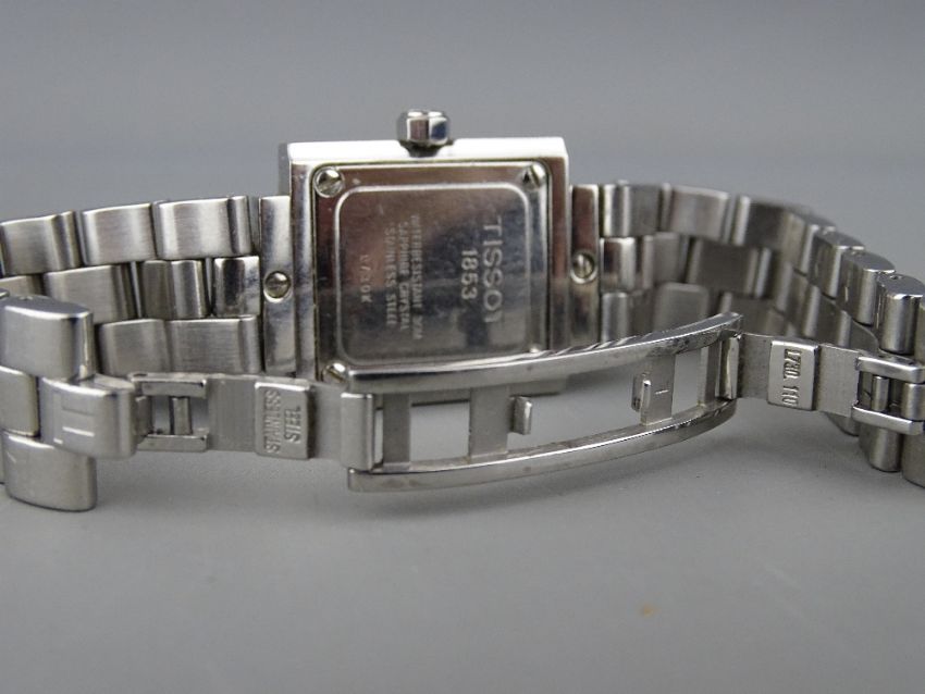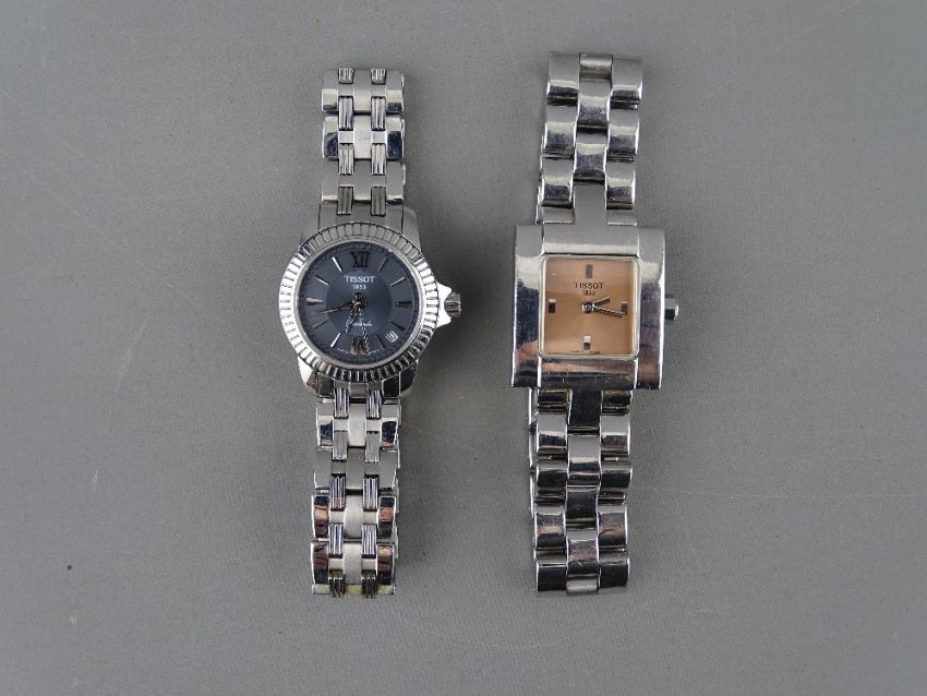 TWO LADY'S WRISTWATCHES - a Tissot Ballade circular dial stainless steel wristwatch with incorporated bracelet and a stainless steel encased pink square dial Tissot watch with incorporated bracelet