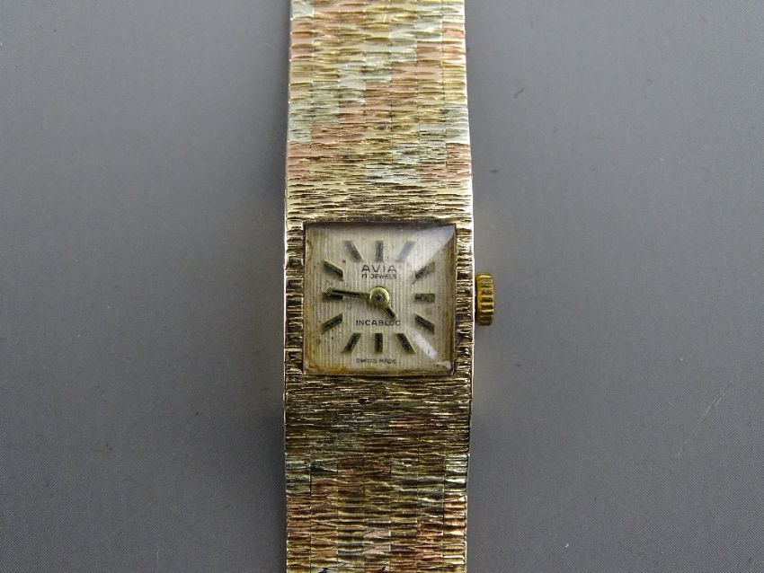 A LADY'S NINE CARAT TRI-COLOUR GOLD ENCASED AVIA WRISTWATCH having a square dial and an incorporated fine bracelet, 36 grms gross