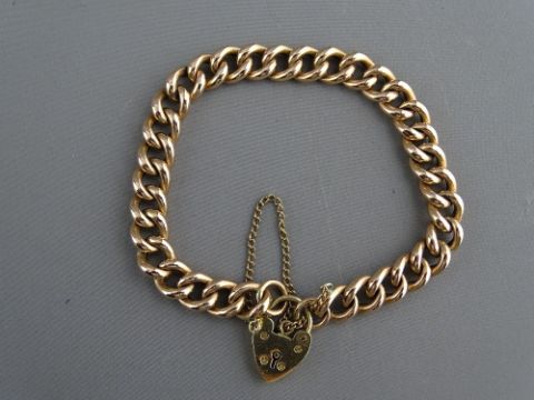 A NINE CARAT GOLD CURB BRACELET with padlock clasp and safety chain, 13.2 grms