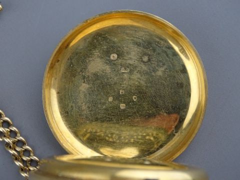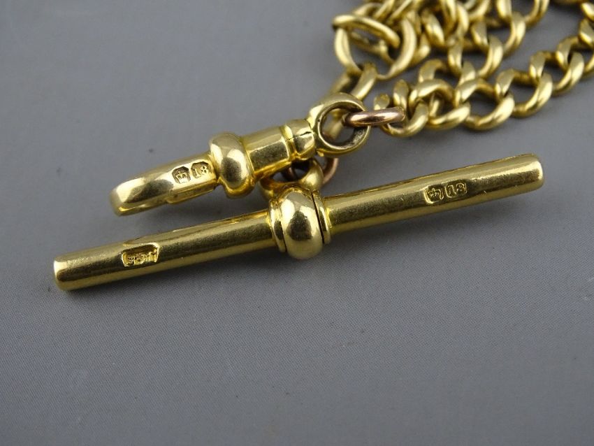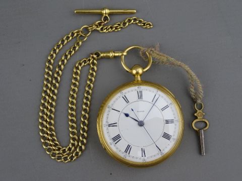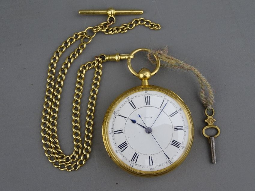 A GENT'S EIGHTEEN CARAT GOLD ENCASED KEYWIND POCKET WATCH with Roman numerals and sweep seconds, inscription within 'Richard Conway, Llandudno, 1909' together with an eighteen carat gold Albert chain with T-bar and swivel (30 grms)