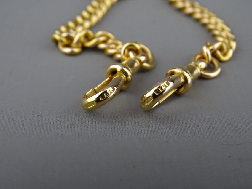 A FIFTEEN CARAT GOLD ALBERT CHAIN with regular links, T-bar and two swivels, 34 grms, all links marked