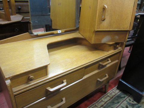 AN EARLY G-PLAN LIGHT WOOD BEDROOM SUITE of two door wardrobe, dressing table, gent's wardrobe/chest and two bedside cabinets
