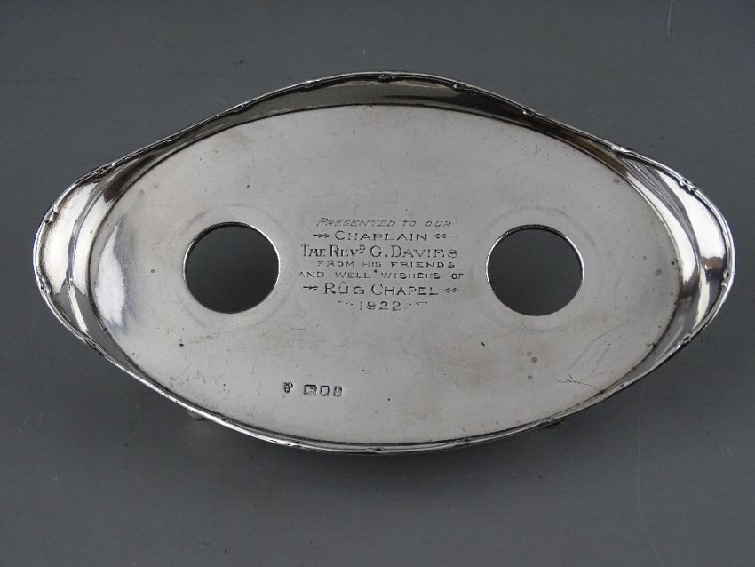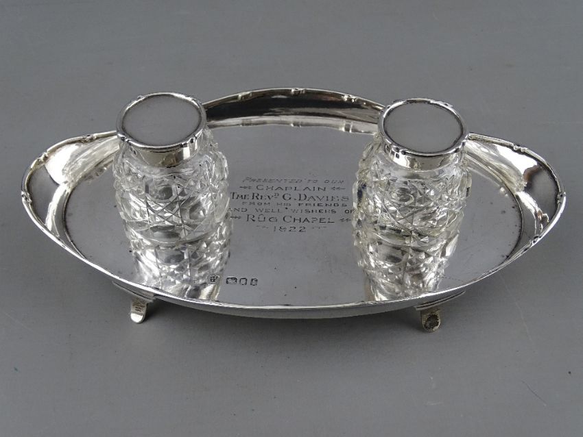 A SILVER OVAL SHAPED TWO BOTTLE INKSTAND with presentation inscription, London 1921, 5.1 troy ozs weighable (one bottle broken), inscription reads 'Presented to Our Chaplain, the Reverend G Davies, From His Friends and Well Wishers of Rug Chapel, 1922'