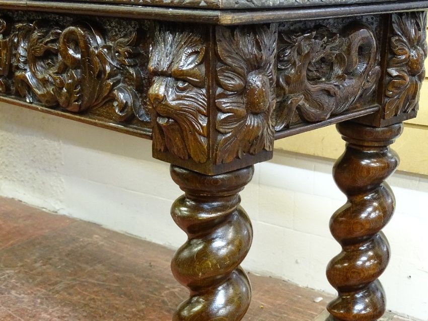 A GOOD CARVED OAK TWO DRAWER HALL TABLE, the 183 cms long top with edge detail over deep carved leaf, mask and mythical beast panels and drawer fronts, raised on substantial barley twist and block supports, 77 cms high, 46 cms deep