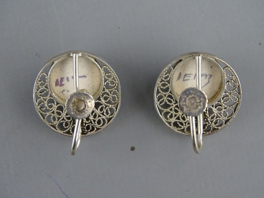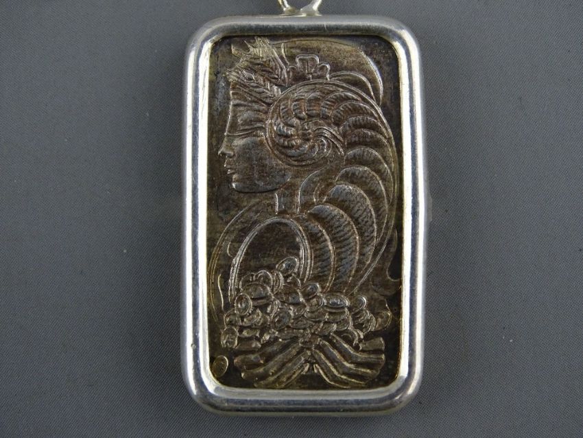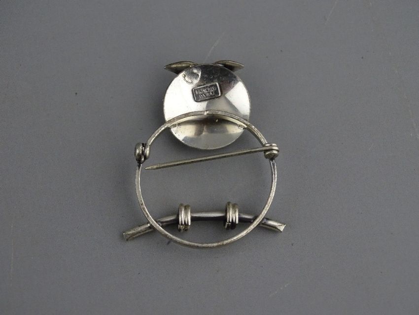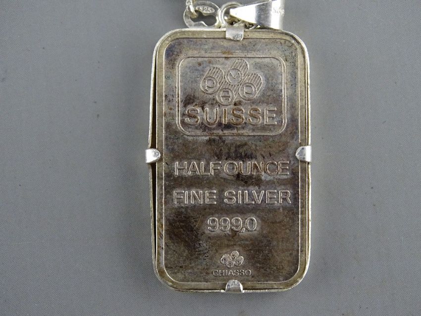 A SILVER INGOT & FINE CHAIN marked 'Suisse Half Ounce Fine Silver 999.0', 20 grms, a sterling silver owl brooch, 6.5 grms and a pair of white metal filigree and blue Delft earrings (parcel of three)