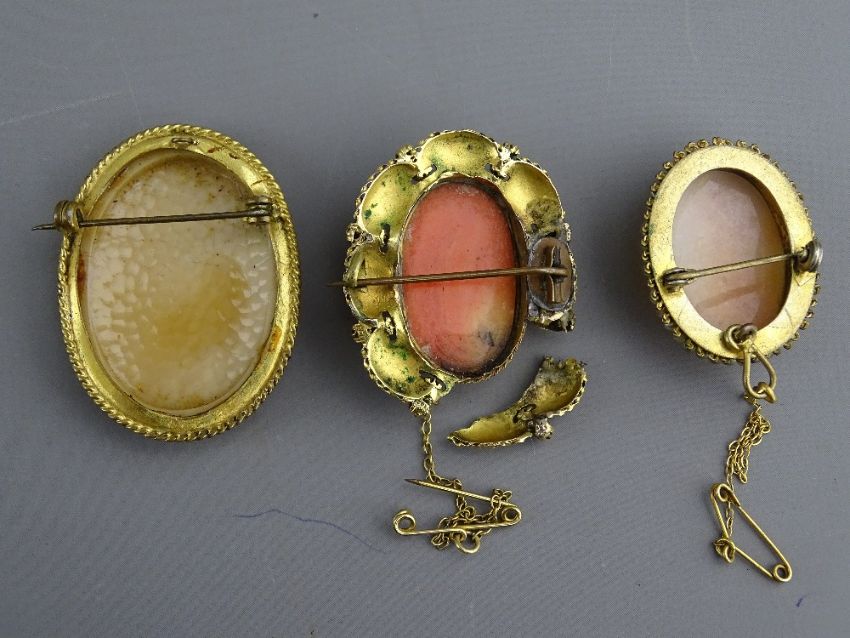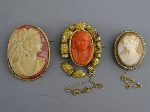 A VICTORIAN CARVED CORAL & PINCHBECK CAMEO, a shell carved cameo and one other (various sizes and conditions)