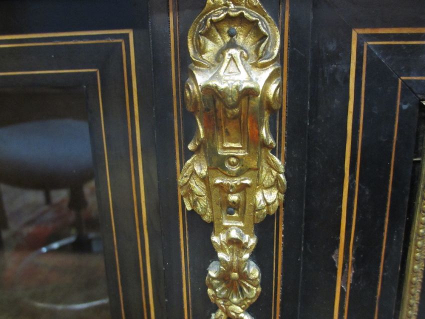 A LATE VICTORIAN EBONIZED BREAKFRONT & ORMOLU INLAID CREDENZA having a centre blind cupboard with attractive decoration and a glass door either side, 167 cms wide