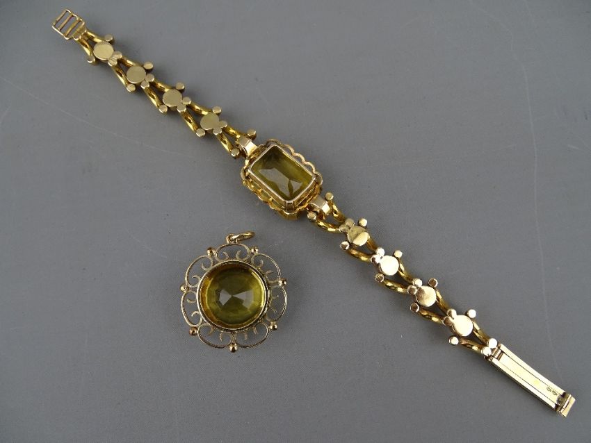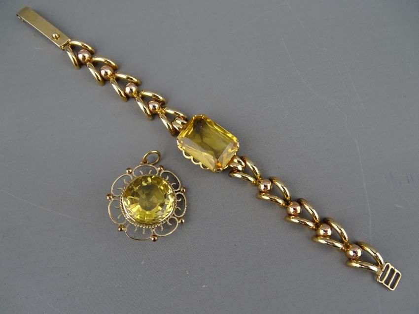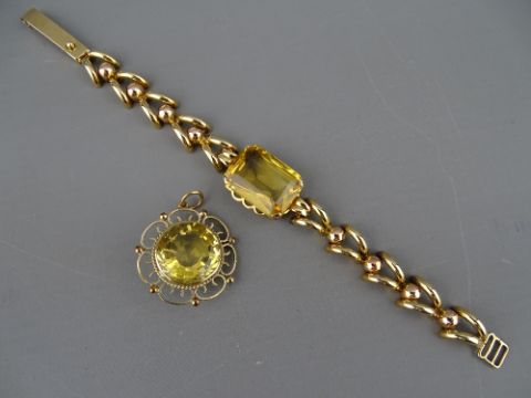 A FOURTEEN CARAT GOLD LINK BRACELET with large centre oblong citrine, 2 x 1.5 cms, 18.5 grms gross and a nine carat gold framed circular citrine pendant, 1.6 cms diameter, 6.5 grms gross