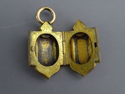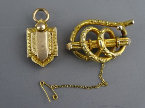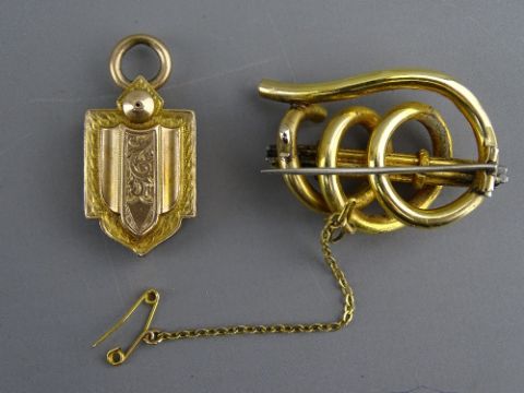 A VICTORIAN PINCHBECK OPEN WORK BROOCH and a shield shaped pendant locket