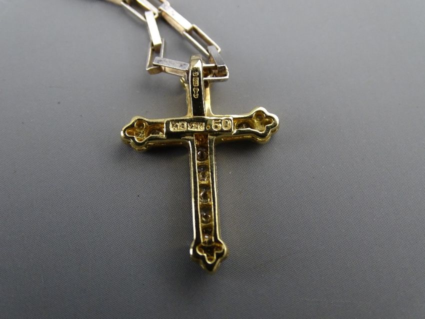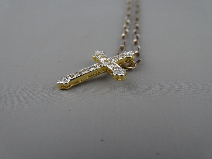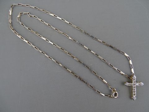 AN EIGHTEEN CARAT GOLD CROSS, encrusted with twelve round cut diamonds, 2 grms gross and a 925 silver oblong link chain, total 6.5 grms
