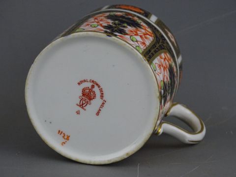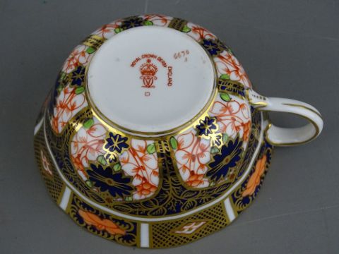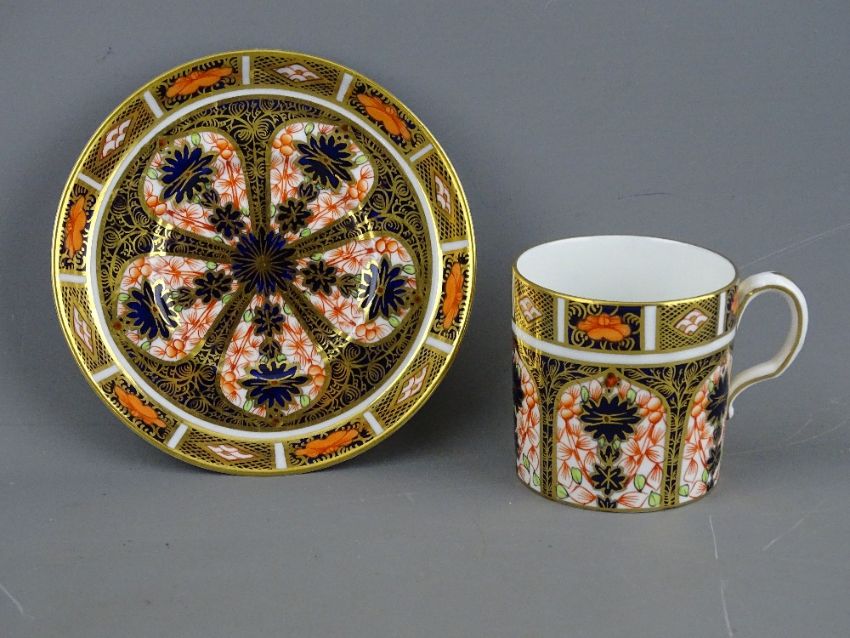 SEVEN PIECES OF ROYAL CROWN DERBY 1128 PATTERN TEAWARE to include a 6 cms high coffee can and saucer, an 8.5 cms diameter teacup and saucer, two side plates 15.5 and 17.5 cms and a 13.5 cms diameter sugar bowl