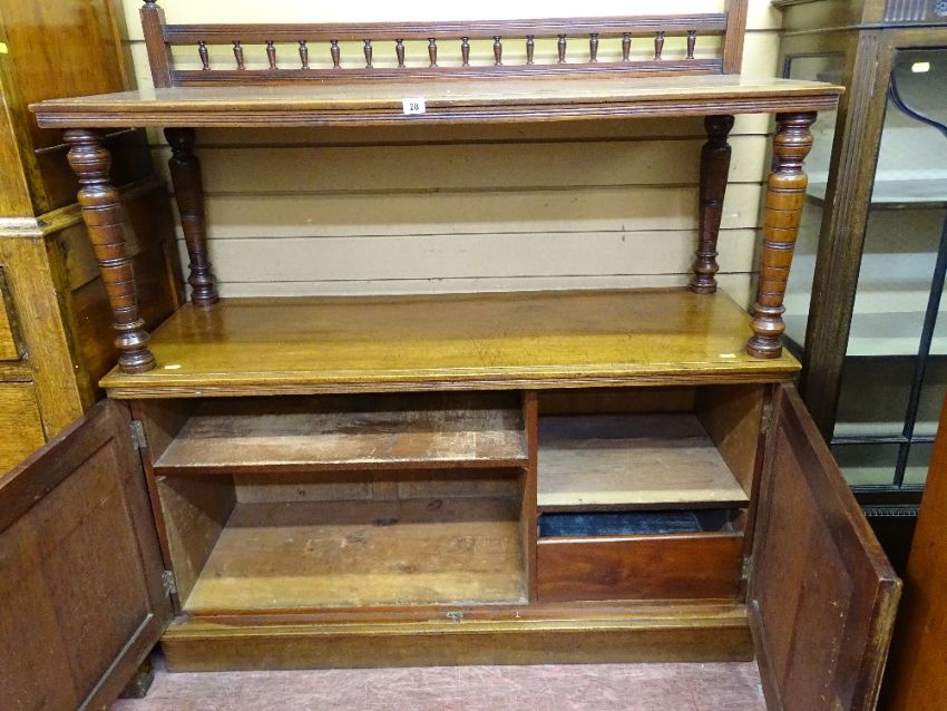 AN EDWARDIAN MAHOGANY DUMB WAITER with gallery back on turned shelf supports with twin lower cupboard doors on a plinth base, 130 cms high overall, 120 cms wide, 45 cms deep