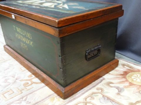 A VICTORIAN PAINTED PINE CHEST, the top ship decorated with a threemaster titled 'Afon Alaw', the front painted with 'T Williams, Port Madog, 1876', 44 cms high, 89 cms wide, 49 cms deep, with iron carry handles