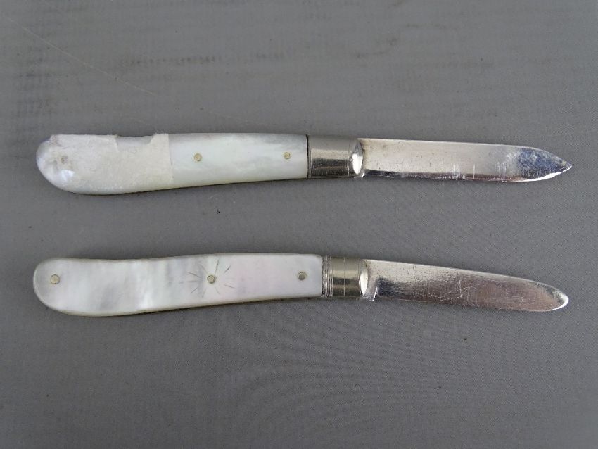 TWO MOTHER OF PEARL SILVER BLADED FRUIT KNIVES