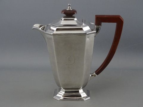 A SILVER COFFEE POT of oblong plain form with a stepped base, composition handle and knop, 19 troy ozs gross, Birmingham 1937, (small dents visible to the bodywork)