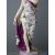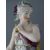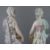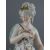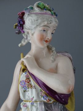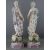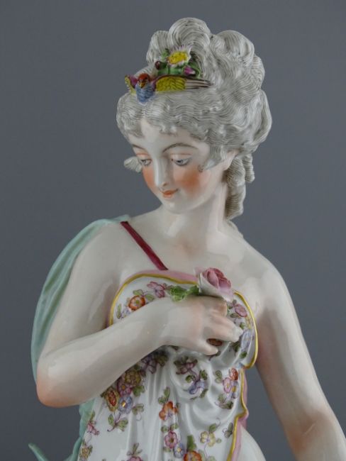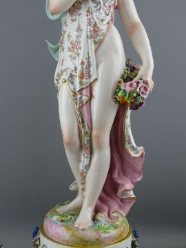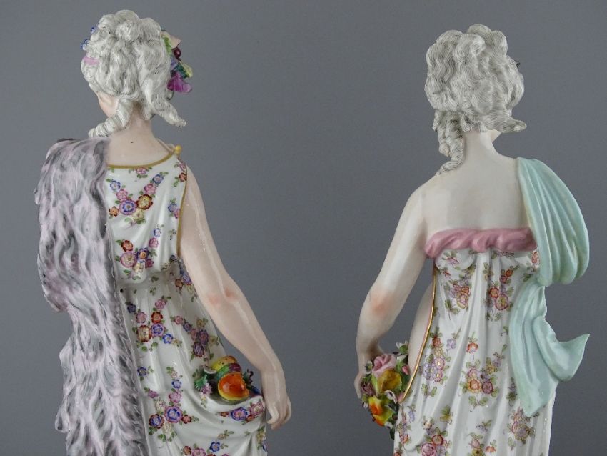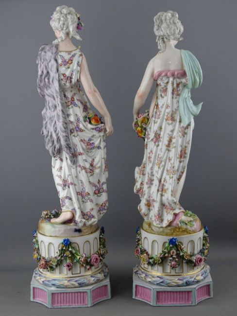 A PAIR OF CONTINENTAL CHINA STANDING FLORAL BEDECKED FEMALE FIGURINES, 46 cms high, standing atop a square shaped drum base with floral garlanded decoration, each plinth being a further 15 cms high
