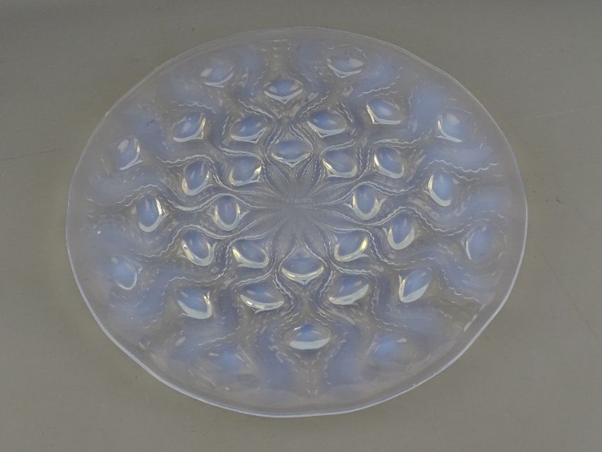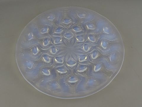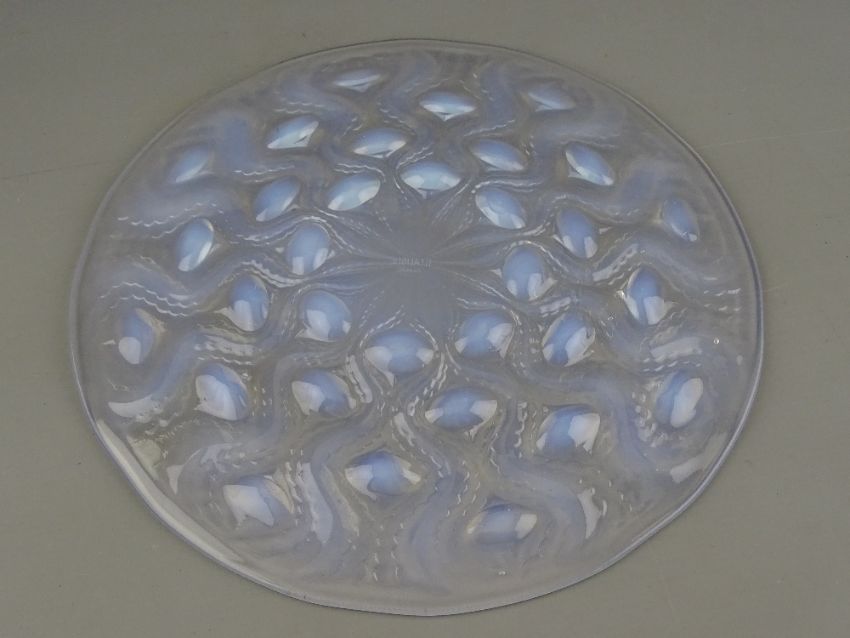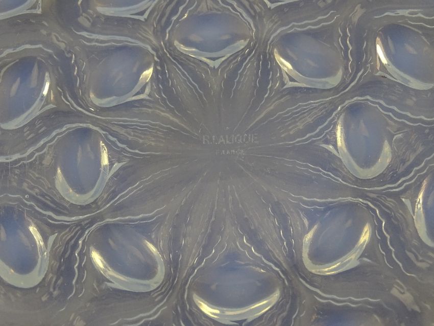 A RENE LALIQUE GLASS CIRCULAR TINTED VINTAGE 'BULBES' COUPE DISH, circa 1930s, 27 cms diameter