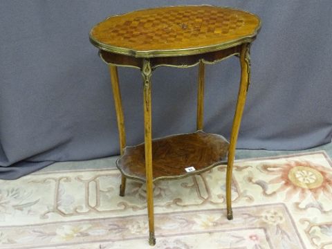 A NEAT FRENCH STYLE KINGWOOD TWO TIER OCCASIONAL TABLE, the shelves having brass rims and with ormolu mounts to the gently curved supports, 55 cms long