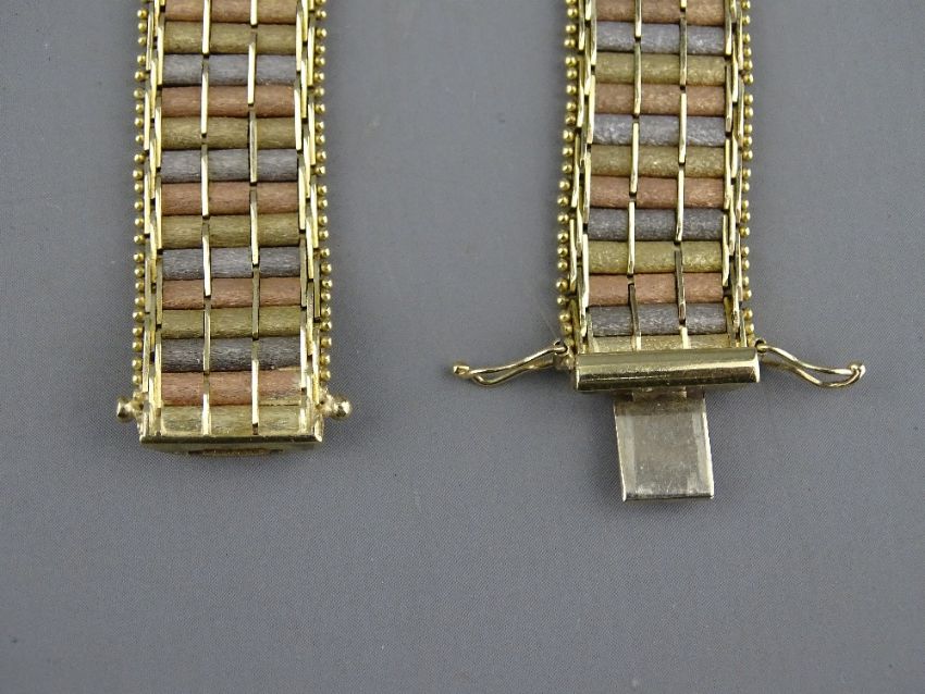 A NINE CARAT GOLD TRI-COLOUR BRACELET, 1.1 cms wide, 22 grms