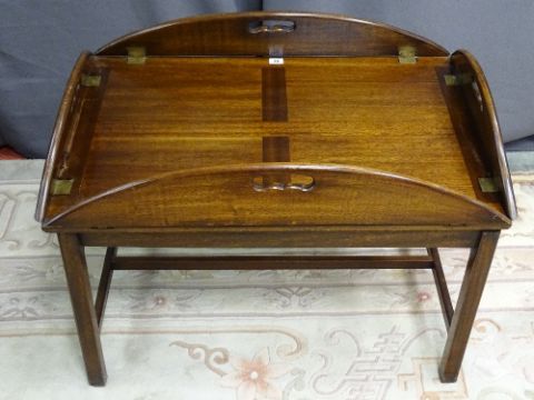 A CONTEMPORARY HARDWOOD BUTLER'S TRAY ON STAND with glass top protector, 58 cms high (handles up), 80 cms wide, 57 cms deep