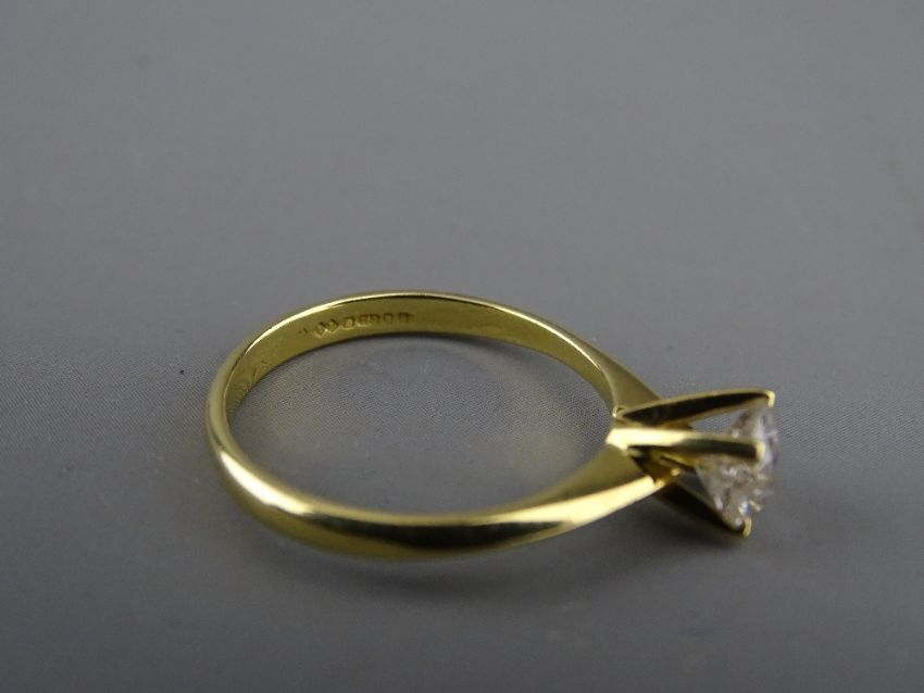 AN EIGHTEEN CARAT GOLD DIAMOND SOLITAIRE RING, visual estimate 0.65 carat, 3 grms gross, size N/O, (chipping and other damage to the stone)