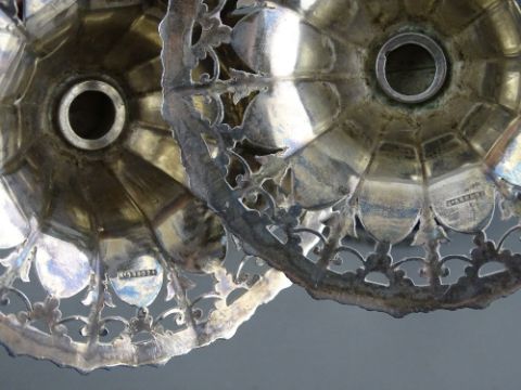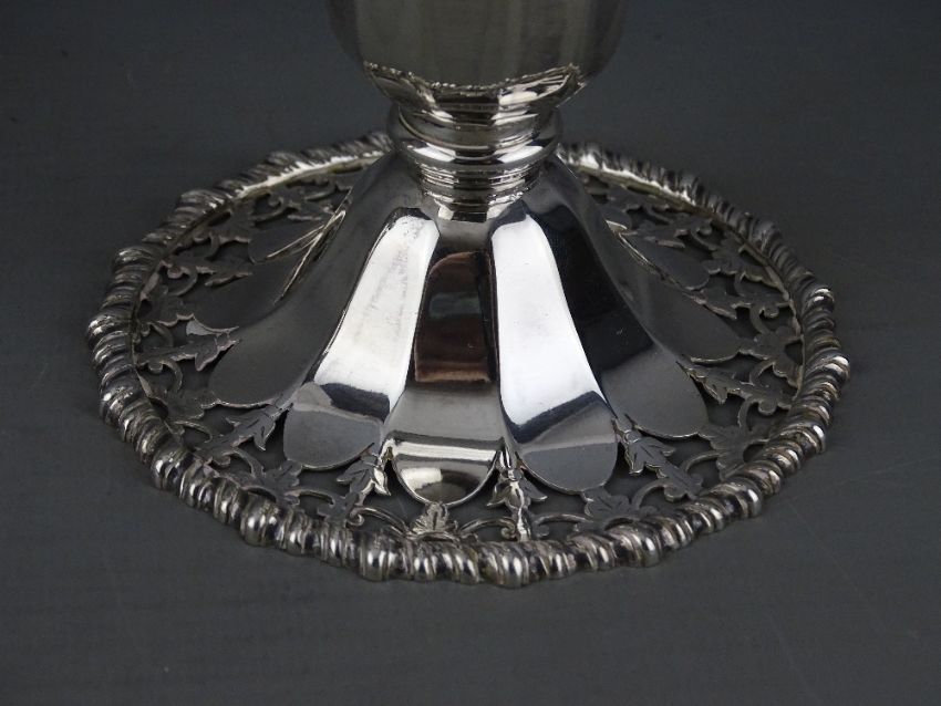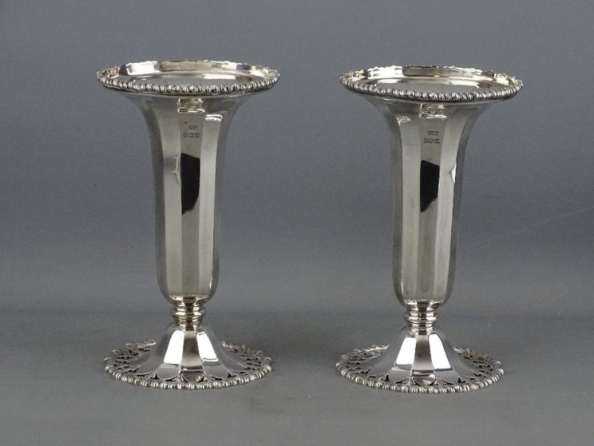 A PAIR OF FINE QUALITY SILVER VASES having pierced floral bases with panelled columns to a wide neck, 17 cms high, 18.5 troy ozs (unloaded), Birmingham 1913