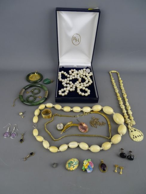 Ivory bead necklace, carved bone example, quantity of metal mounted jade type jewellery, two simulated pearl necklaces etc
