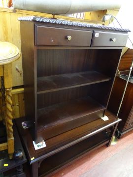 Polished wood and inlaid two tier coffee table and a carved edge two drawer, two shelf console table