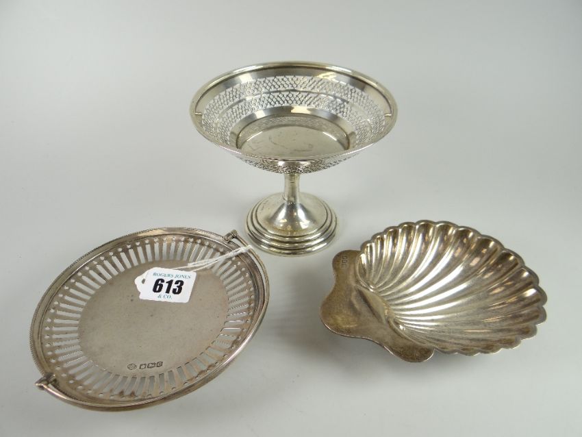 Three silver bon-bon dishes comprising a pierced circular example raised over a circular spreading foot, a pierced example with swing handle and another dish in the form of a scallop, 9.2oz