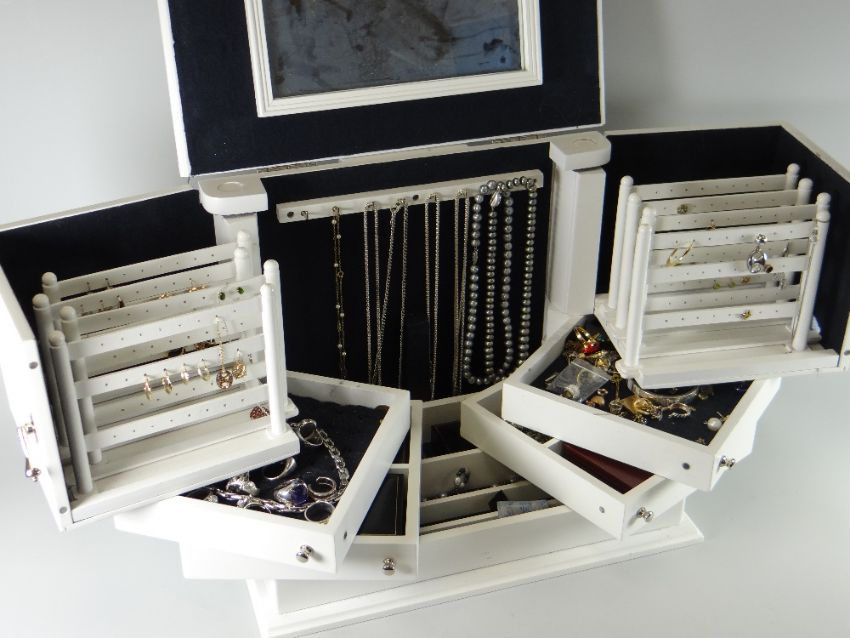 A cream wood concertina jewellery box and contents including silver dress rings, necklaces ETC