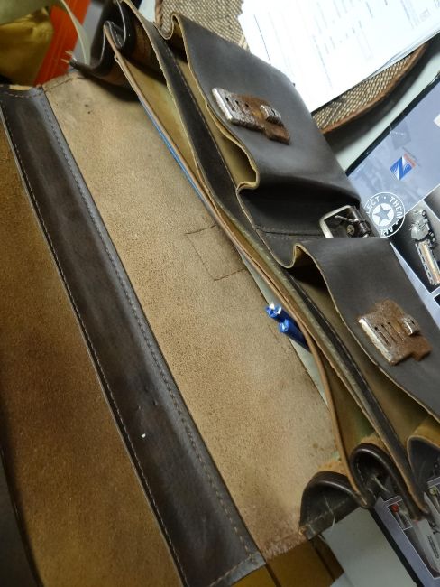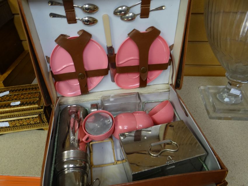 A vintage cased picnic set together with a leather document case