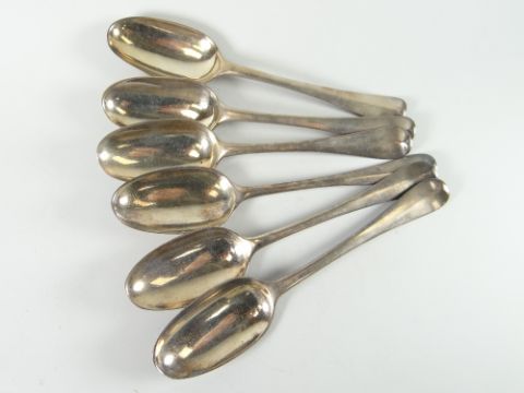 A loose set of six silver serving spoons, hallmarks rubbed, probably Georgian, 13.9oz