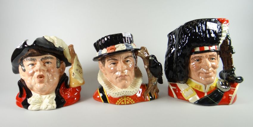 Seven Royal Doulton military figure character jugs comprising Lord Kitchner, Captain Bligh, The Piper, The Yeomen of the Guard, Napoleon, Town Crier, Winston Churchill together with a Shorter & Son character jug of a Beefeater