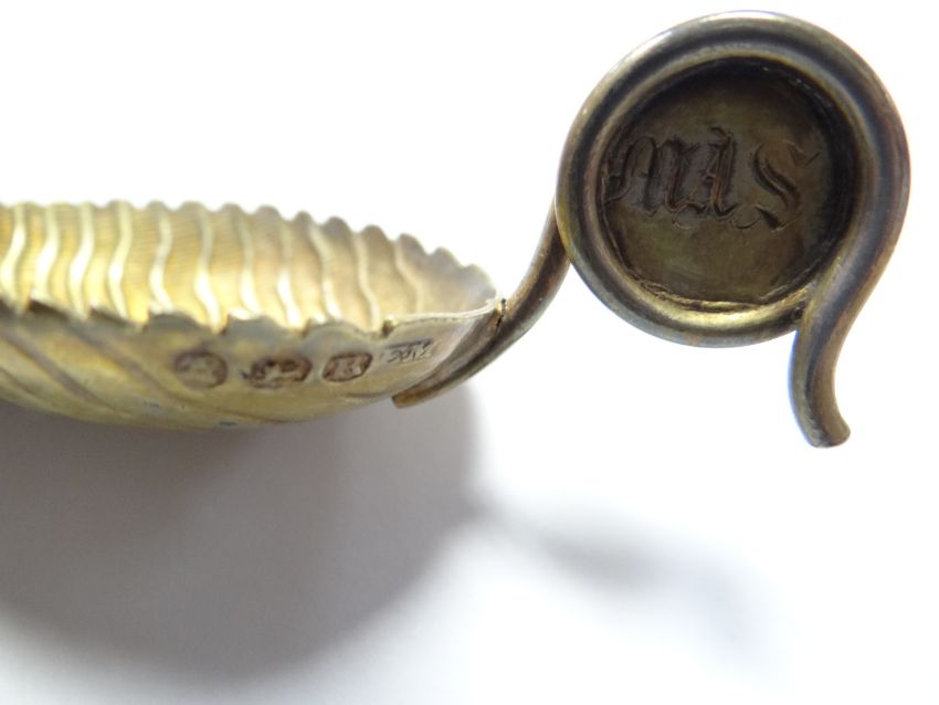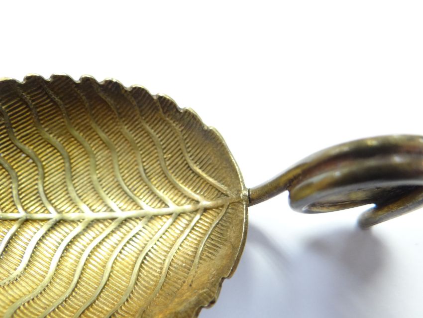 A Georgian silver caddy spoon in the form of a textured leaf with twisting handle bearing engraved monogram, 18grams Condition reports provided on request by email for this auction otherwise items purchased `as seen`very small crack between the handle and bowl