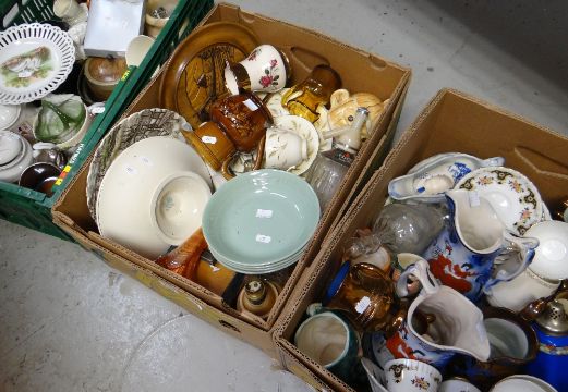Three boxes of various china and glass including vintage soda siphon, royal commemorative ware, various Staffordshire teaware ETC