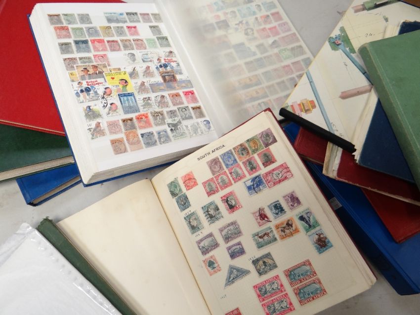 A brown cardboard carton containing various stamp albums including 'Simple Blank Album' in red, later folders ETC