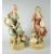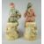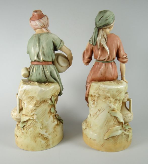A pair of Royal Dux models being an Arabian boy and girl, the boy in traditional dress pouring water into a cup while sat on a stump, the girl with mandolin, 32cms high