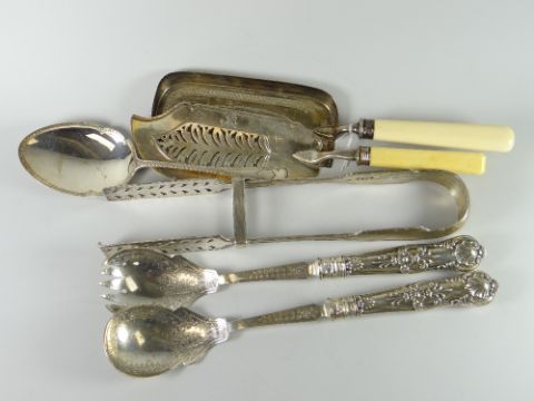 An interesting parcel of silver / part-silver flatware comprising pair of Walker & Hall solid silver Queens pattern salad servers with engraved bowls, a bone handled silver crumb scoop, a monogrammed and pierced silver fish slice, a silver spoon with engraved bowl and a good pair of solid silver asparagus tongs