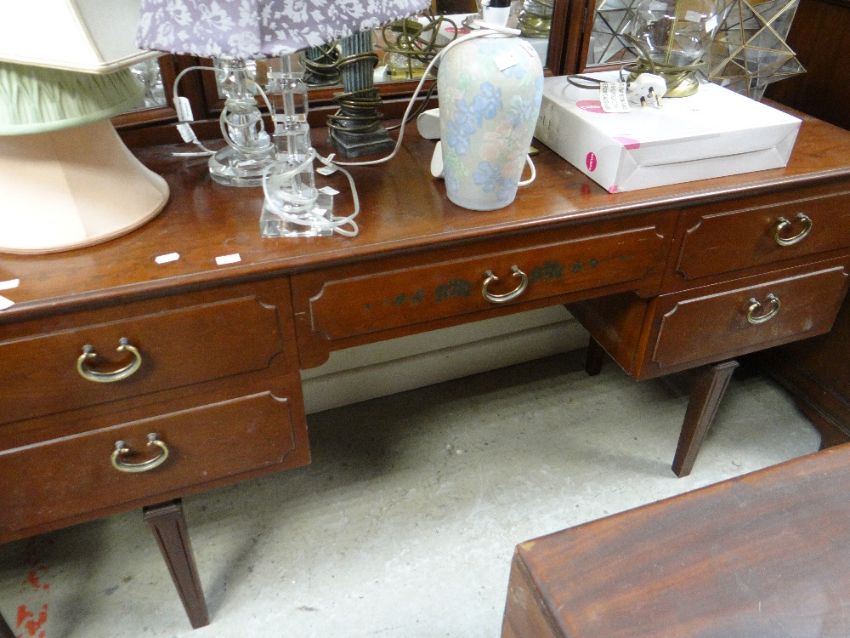 A Stag Minstrel tri-fold mirror dressing table and matching night cabinet and stool together with believed Stag chest of four long and two short drawers and matching narrow three-drawer chest and another modern tri-fold dressing table