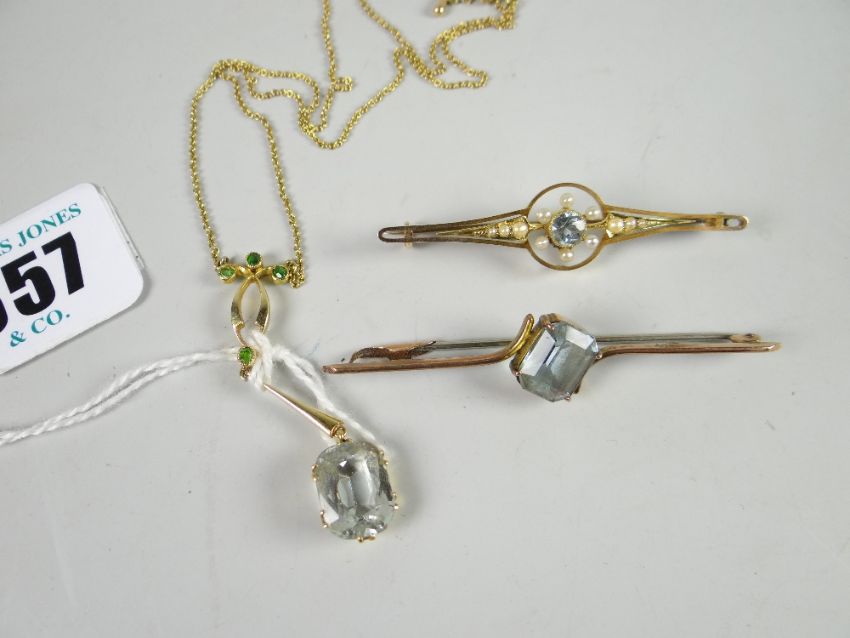 Two aquamarine set bar brooches in 9ct & 15ct yellow gold and an aquamarine / quartz pendant and yellow gold necklace