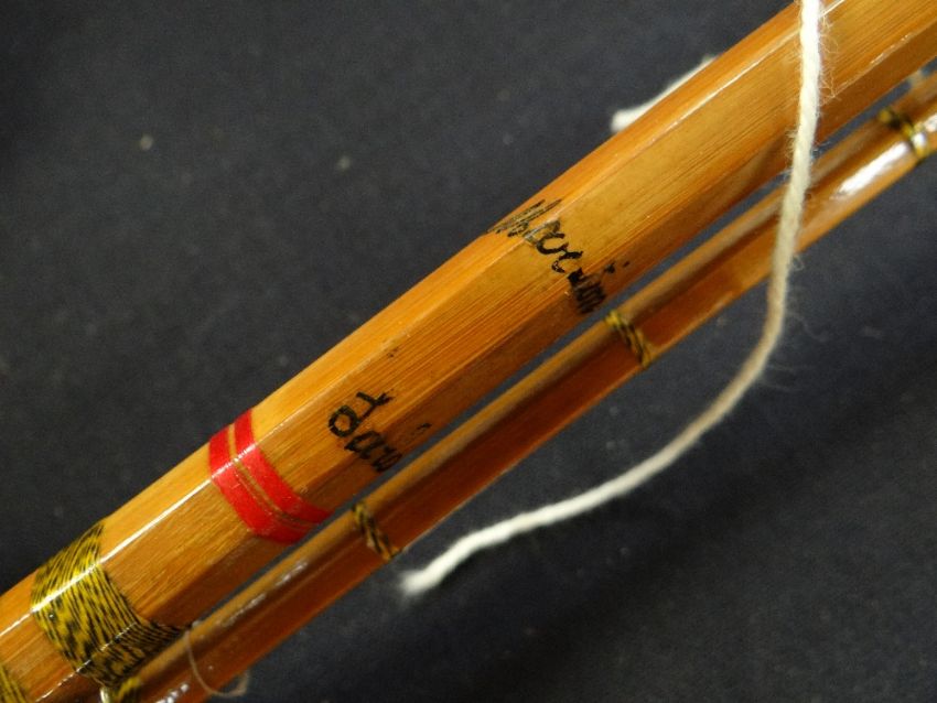 A Martin James vintage split cane two-piece fly fishing rod with cork handle and canvas bag pack containing reels and accessories ETC
