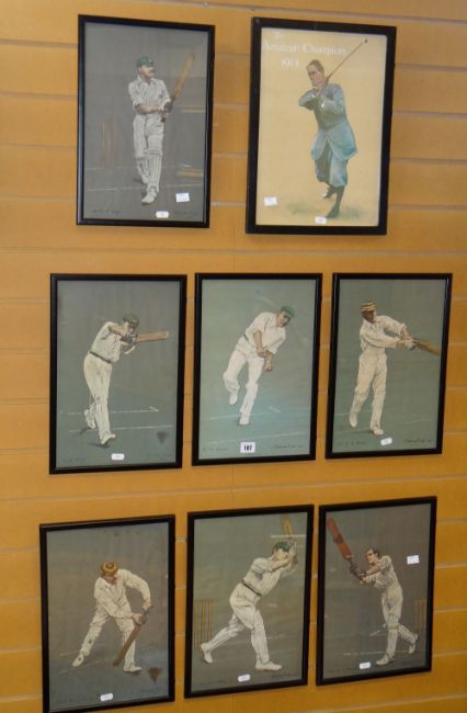 A framed series of seven vintage cricketing prints, each depicting players from the early part of the twentieth century, printed signature by the artist and dated 1905, 37 x 24cms and a golfing print of the Amateur Champion 1913
