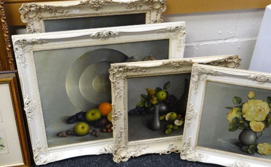 A parcel of large framed prints and paintings including a series of four still life oil paintings in white moulded frames ETC