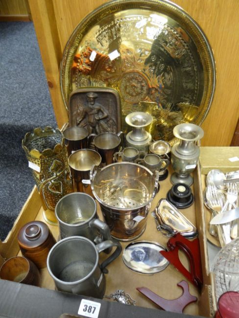 A parcel of mixed metalware including trench-art decorated brass vase, white metal vintage purse ETC