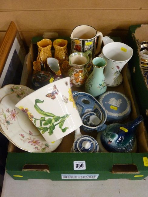 Mixed box of collectables including a Crown Ducal tube lined jug, Spode 'Floral Haven' planter etc
