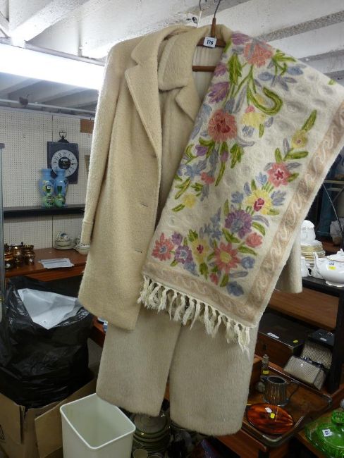 Two vintage lady's light coloured coats and a vintage throw